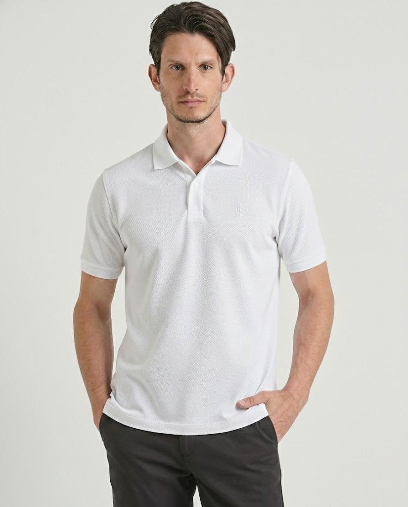 Polo de manga corta en piqué 100% algodón peruano; cuello y puños de punto; tapeta reforzada de dos botones; aberturas laterales con cinta interior; pespuntes a tono; etiqueta interior tejida con discreto logotipo. Diseñado para conservar su forma y textura refinada con el paso del tiempo, fusionando la tradición deportiva con la elegancia de la sastrería moderna.