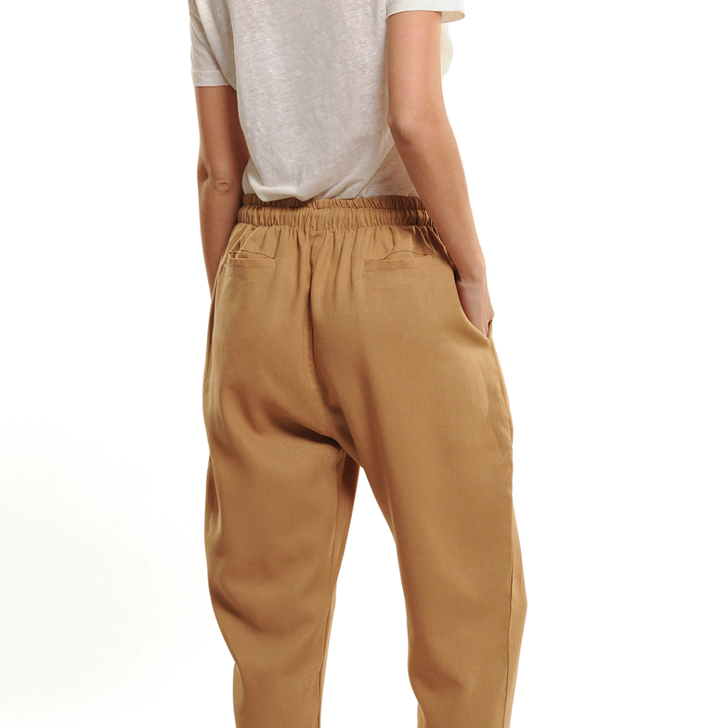 UNISEX . Pantalon tipo babucha confeccionado en lino algodon con cintura elastizada y cordon de algodon natural embutido. Posee dos bolsillos diagonales en el frente. Lleva costuras envivadas en el ruedo que permiten su arremangado