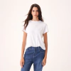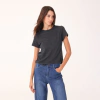 Remera de silueta recta, manga corta, escote REDONDO y largo arriba de cadera. Ver detalle del tramado del tejido en la foto.