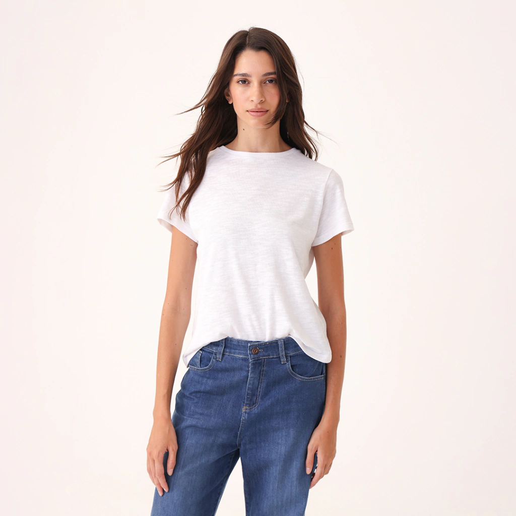 Remera de silueta recta, manga corta, escote REDONDO y largo arriba de cadera. Ver detalle del tramado del tejido en la foto.