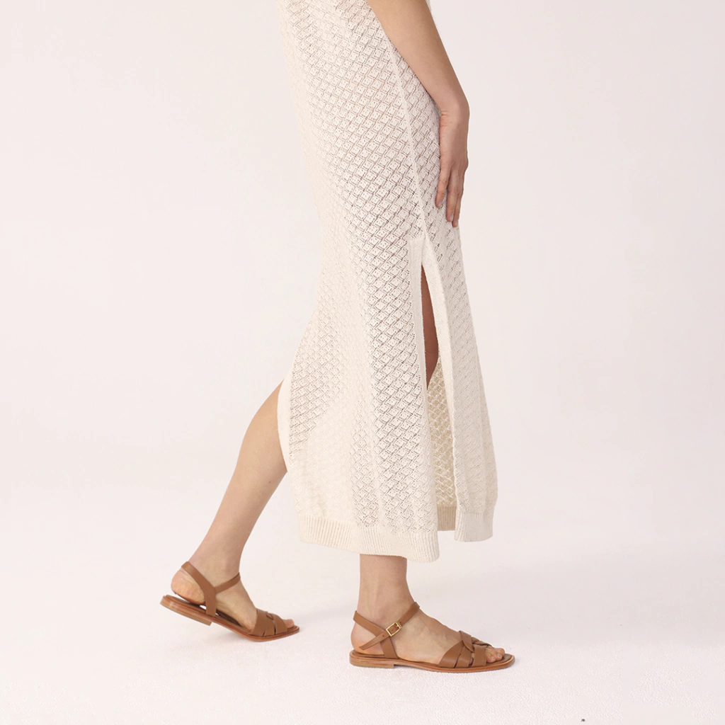 Vestido de hilo tejido con tramado fantasia, recto con tajos a los costados, sin mangas, escote redondo en el frente y espalda.