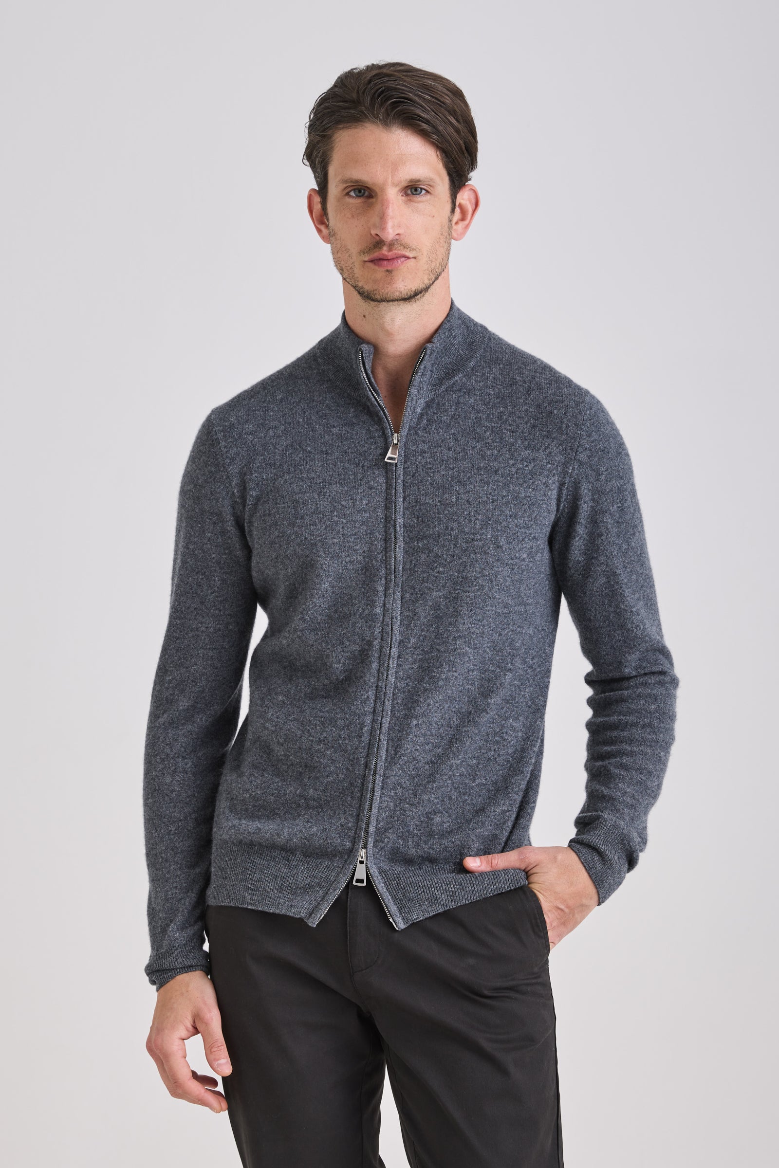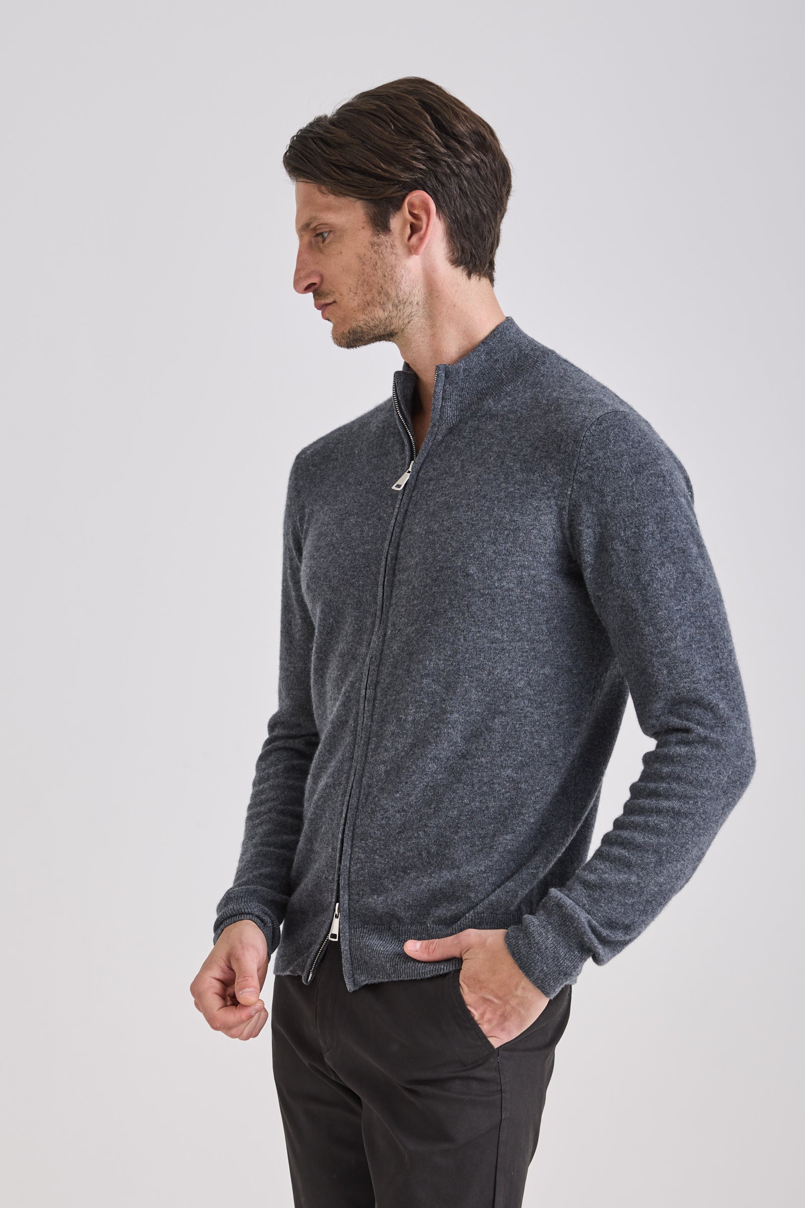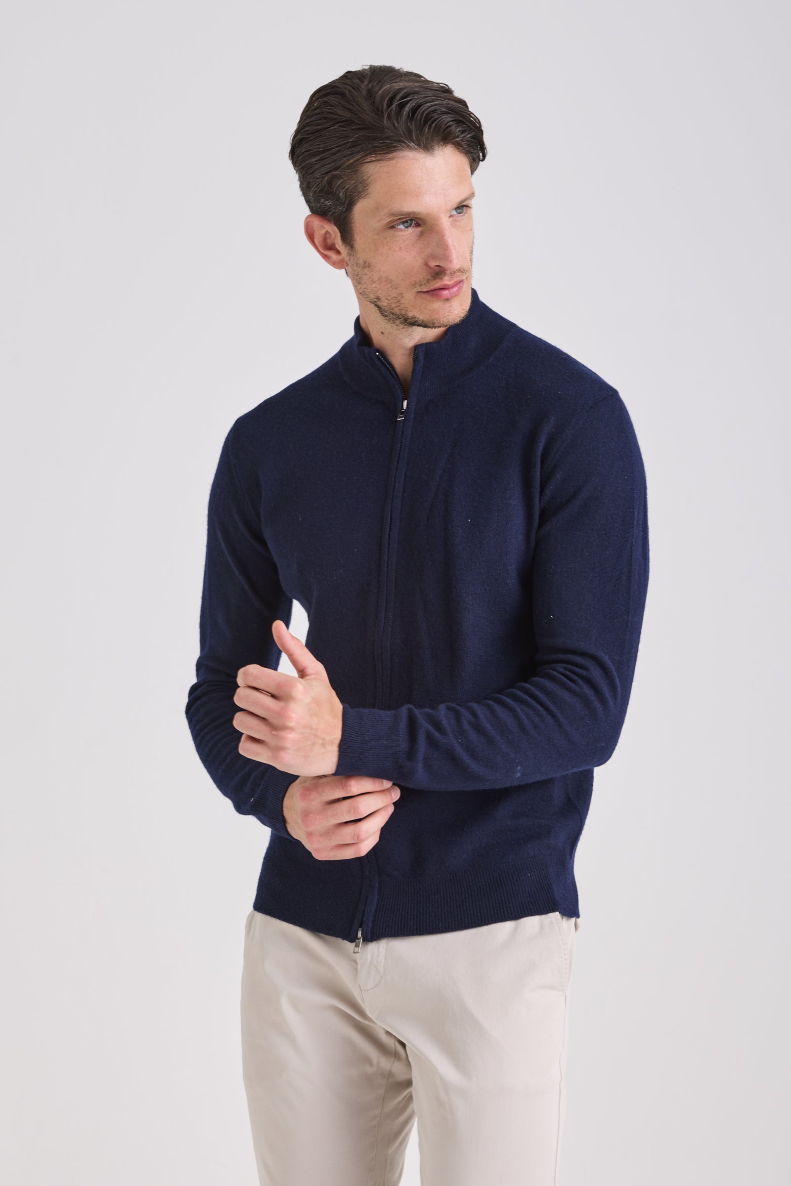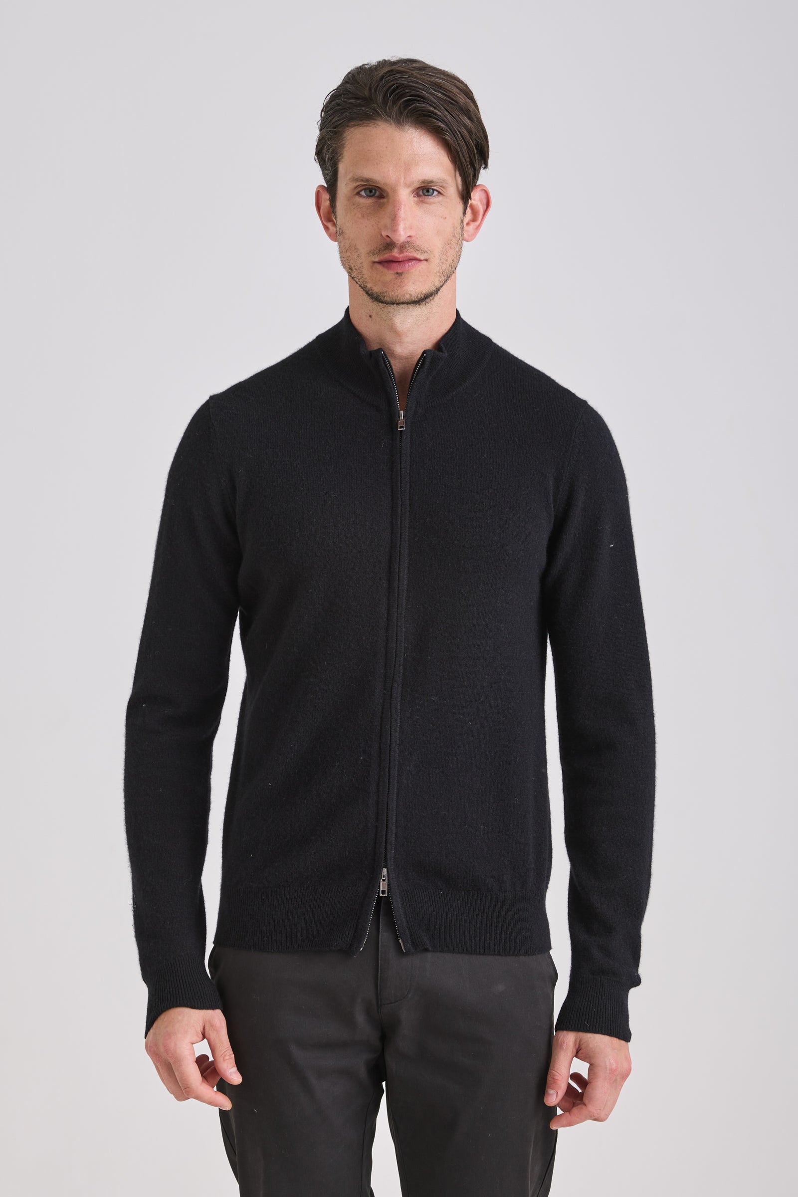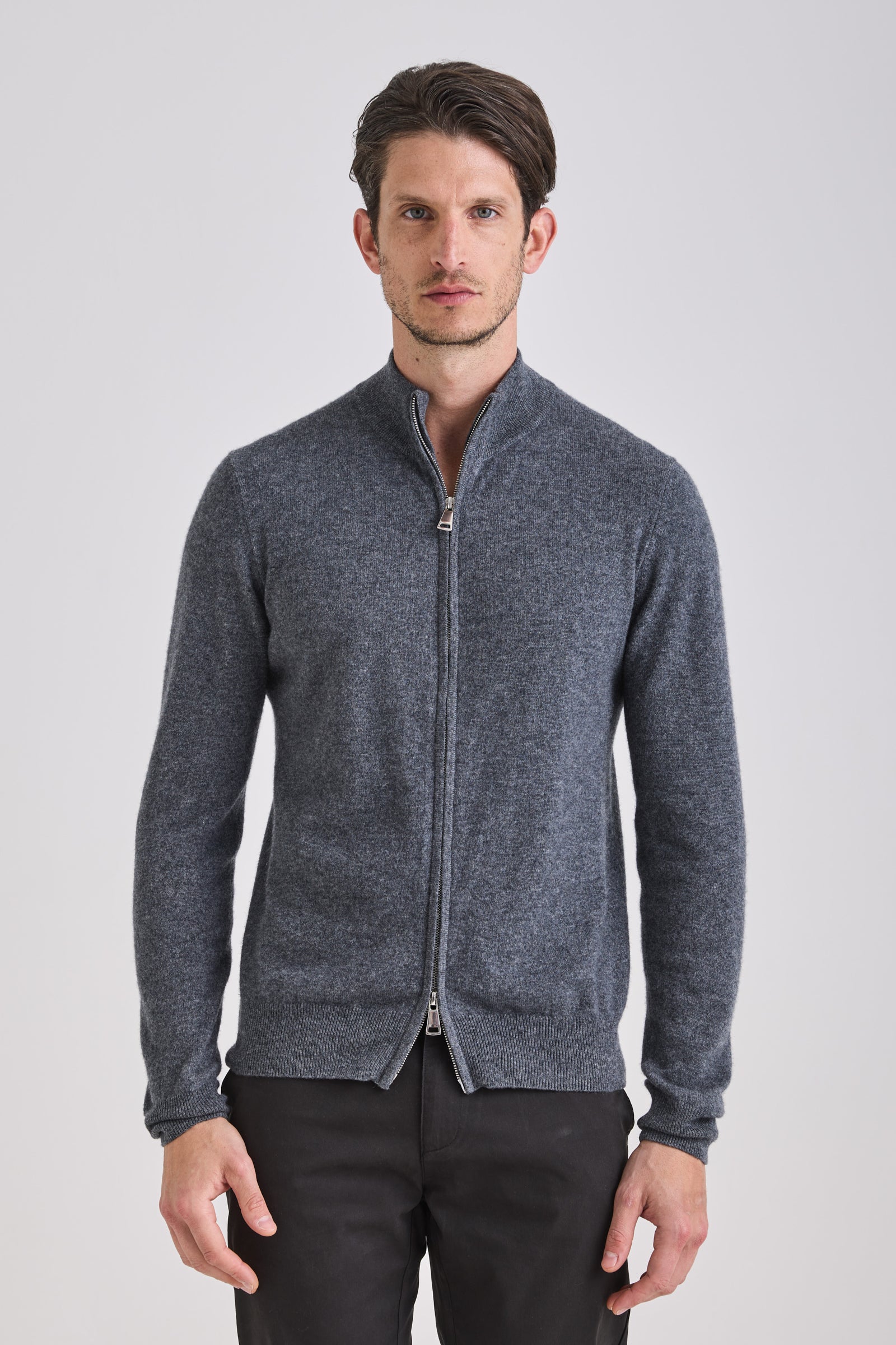 Knitted from a balanced blend of cashmere and wool, it provides a refined hand feel and lightweight warmth while maintaining shape definition. A double-slider metal zipper and standing collar enhance its technical yet elegant character. Versatile and functional, it transitions seamlessly between layering or stand-alone wear across seasons.