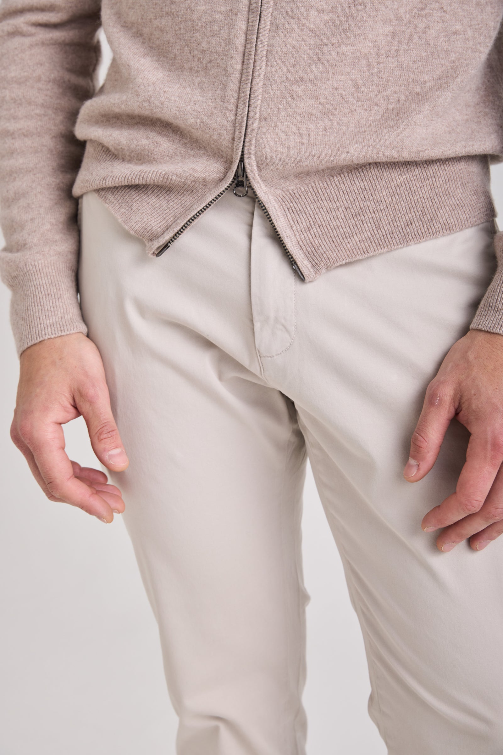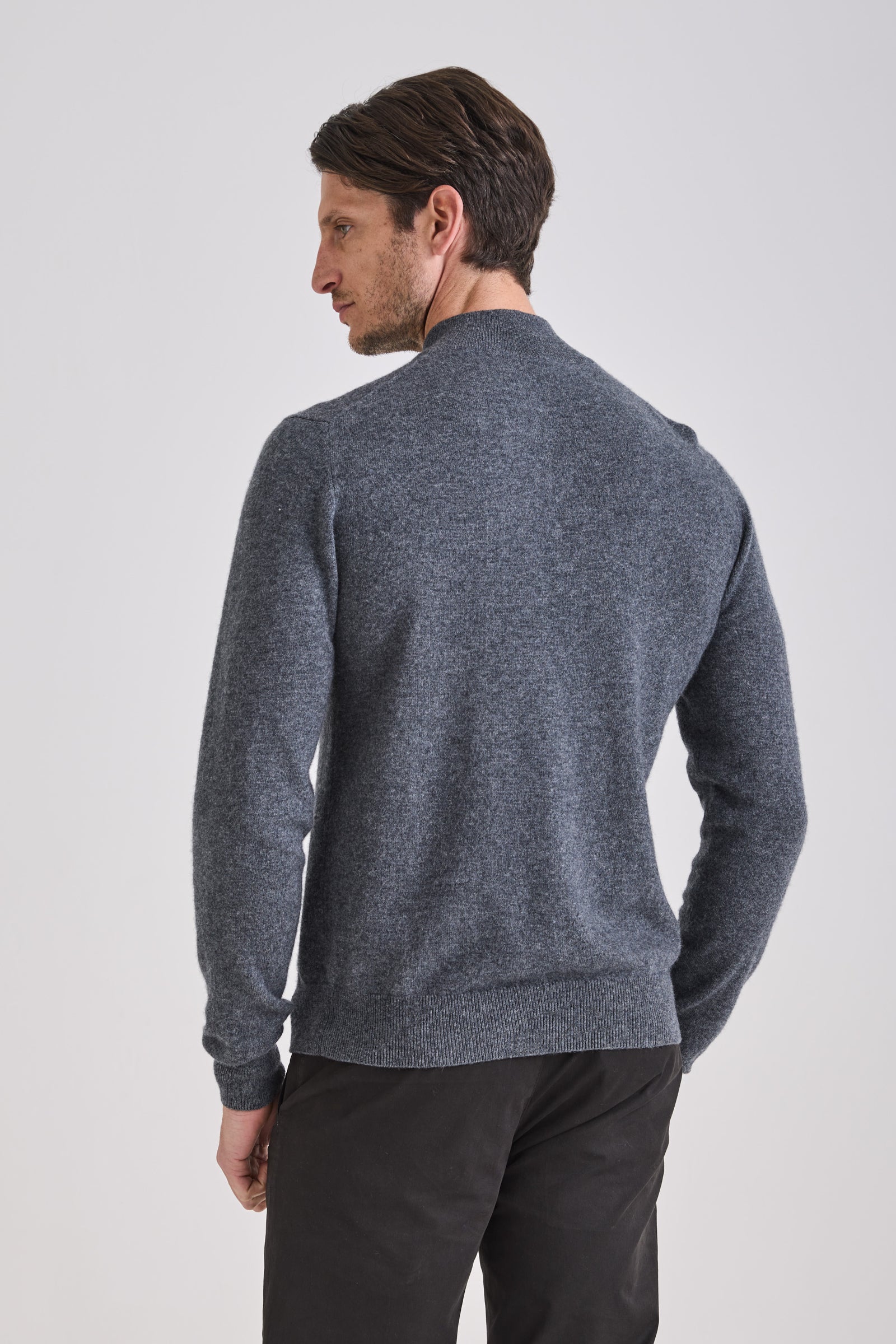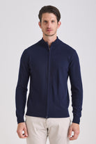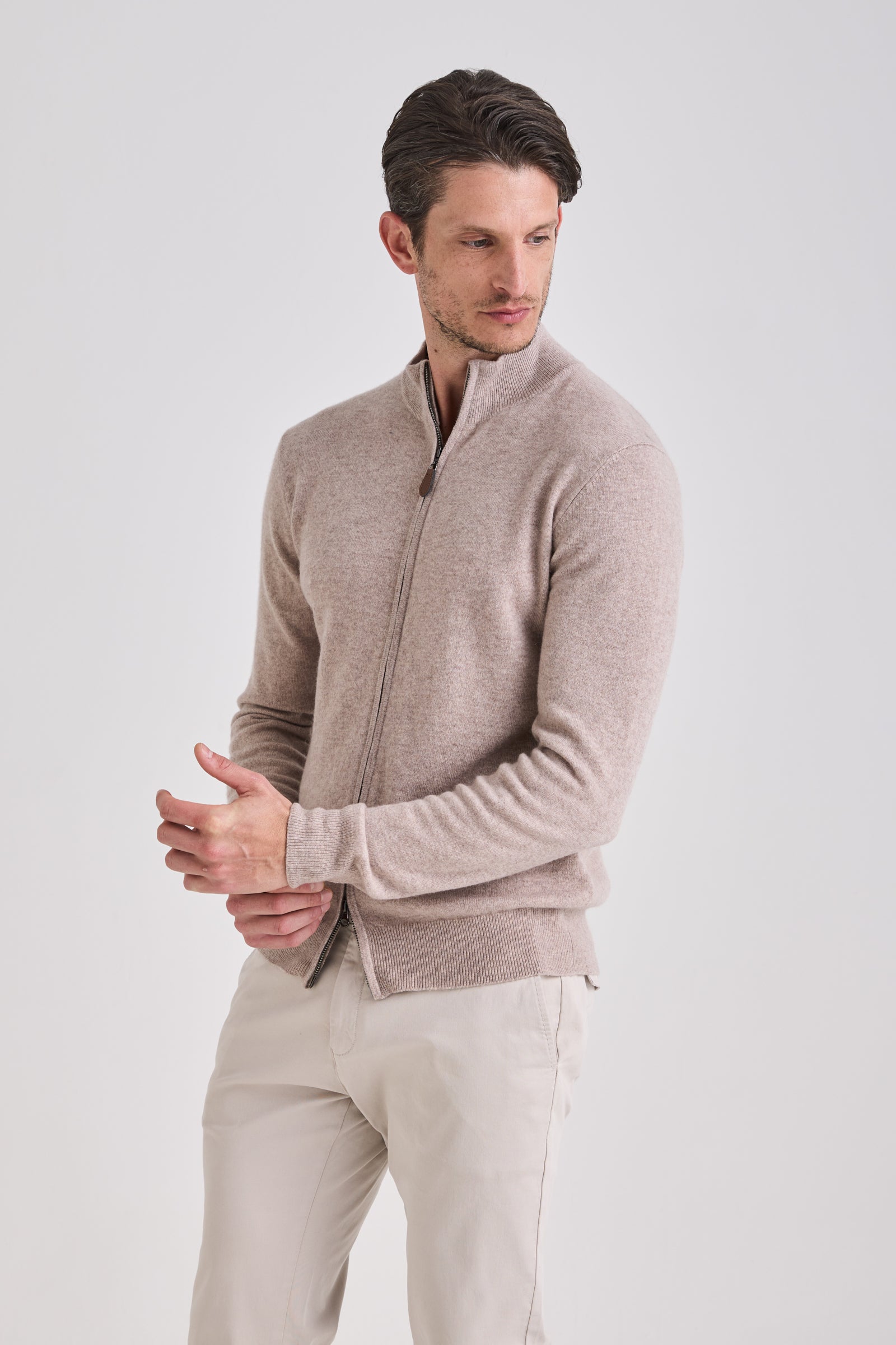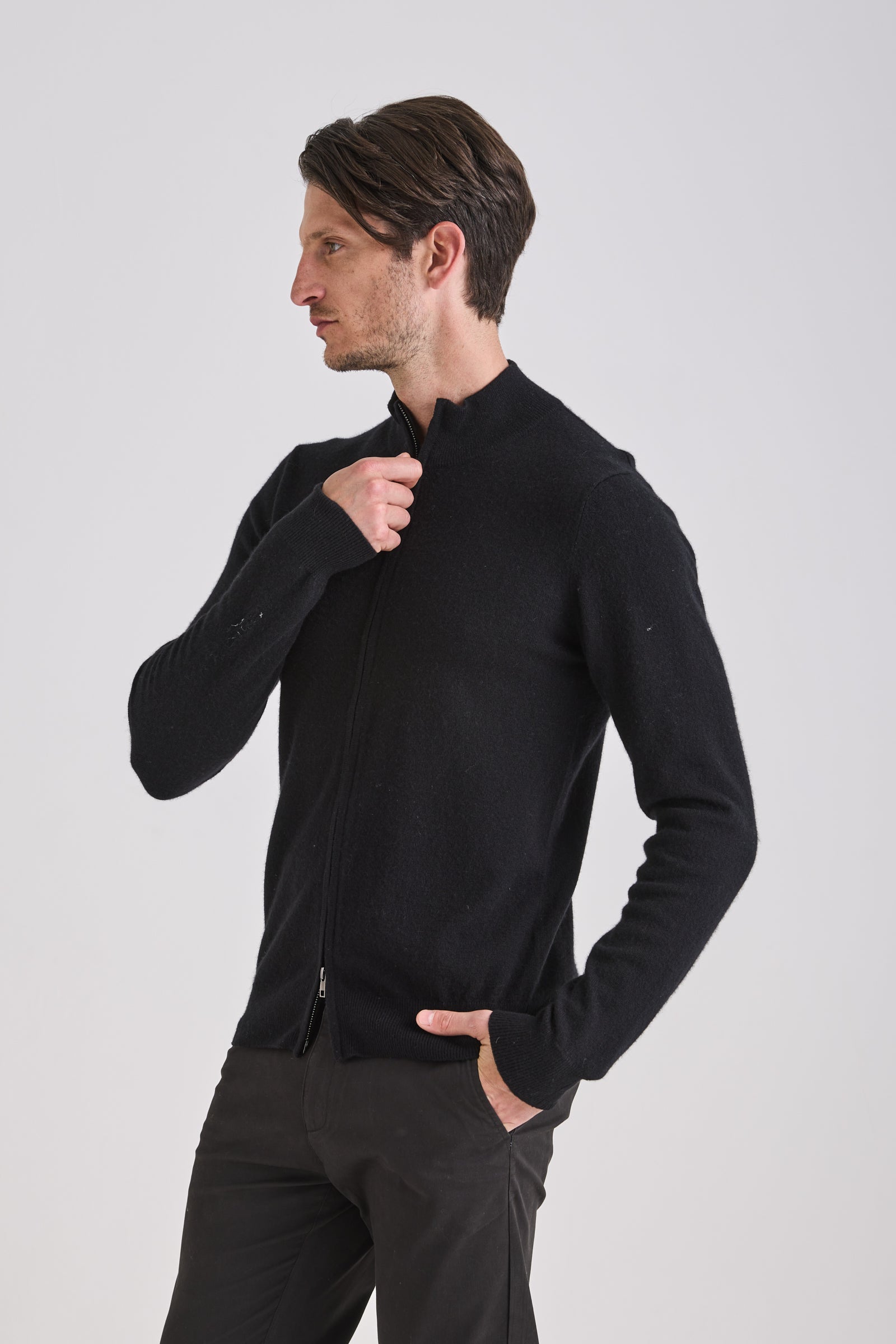Knitted from a balanced blend of cashmere and wool, it provides a refined hand feel and lightweight warmth while maintaining shape definition. A double-slider metal zipper and standing collar enhance its technical yet elegant character. Versatile and functional, it transitions seamlessly between layering or stand-alone wear across seasons.