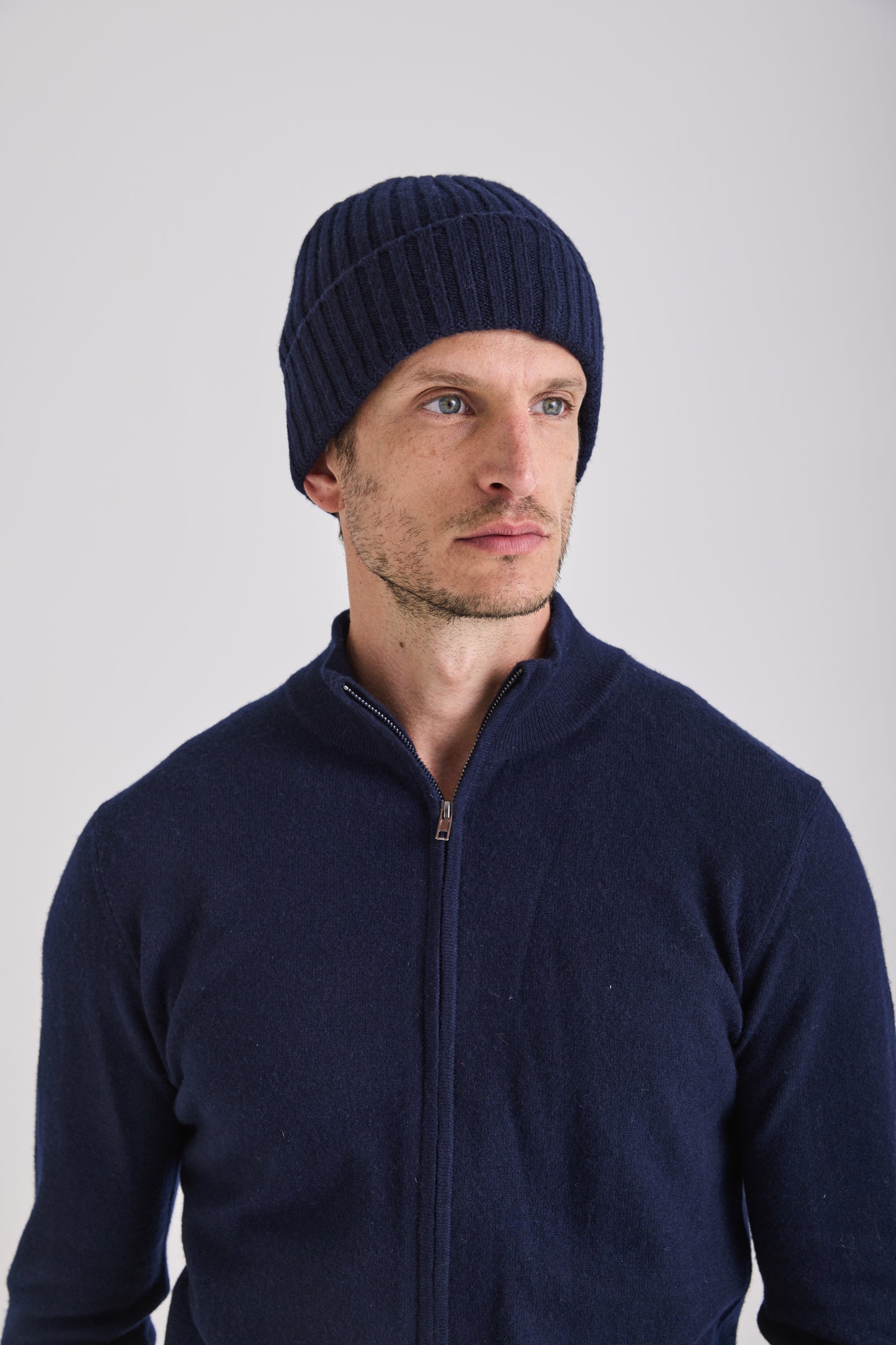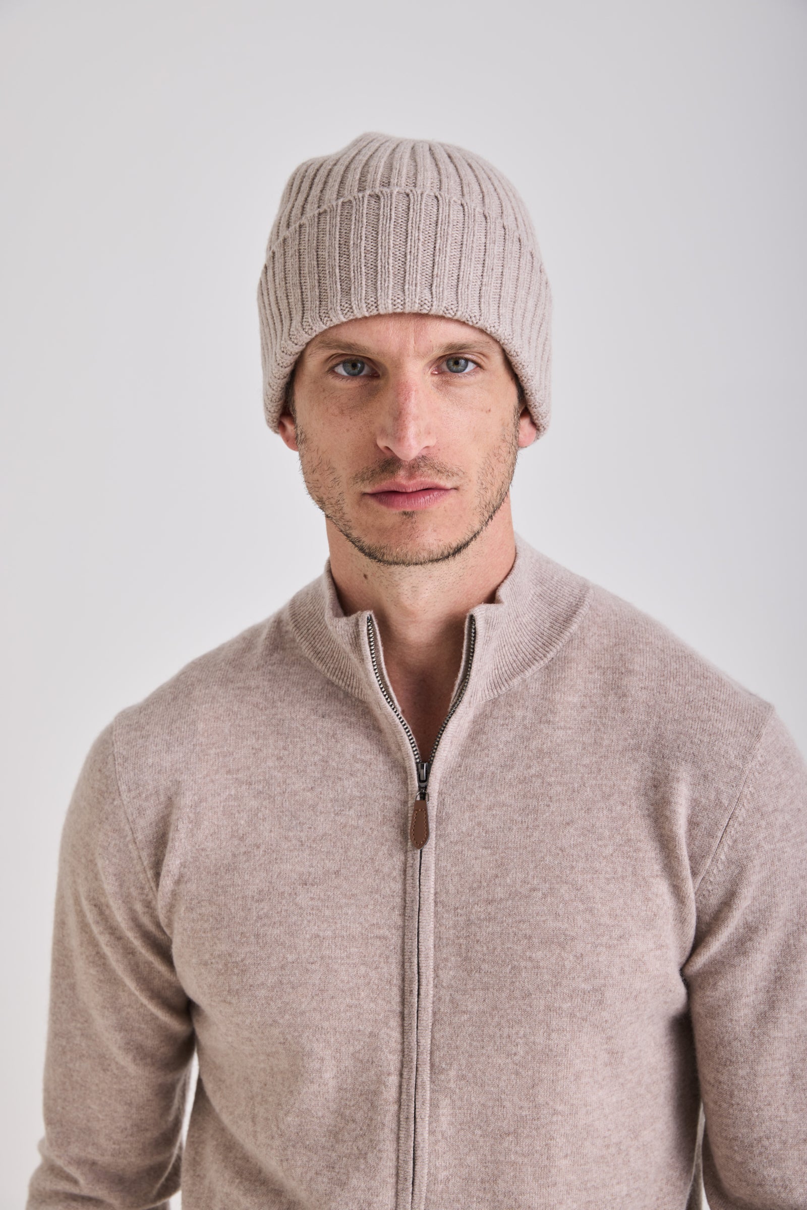 A pure cashmere beanie defined by softness, warmth, and an understated ribbed texture.