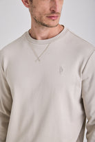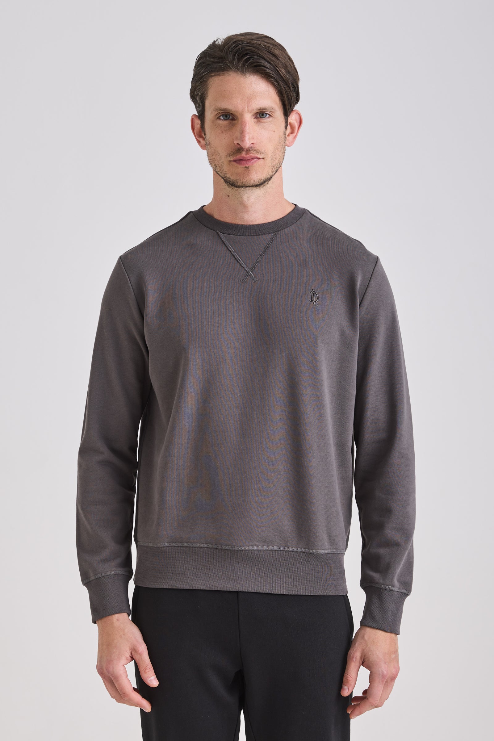 Crewneck sweatshirt; brushed cotton terry fabric; front “V” insert; tonal LD chest embroidery; ribbed cuffs and hem; internal woven label; made in China.