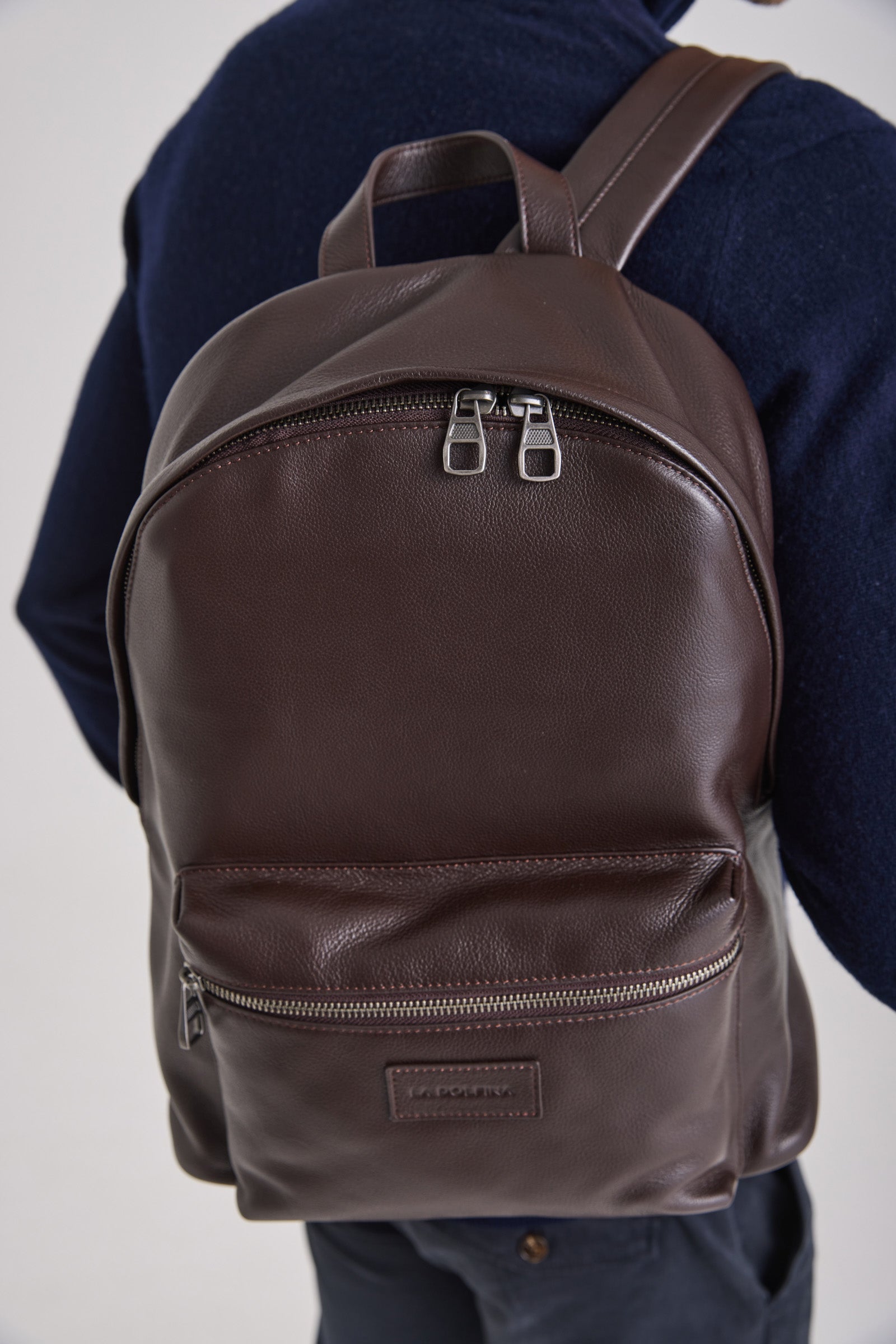 Backpack in full-grain leather; double metal zipper with braided leather pullers; front pocket with zipper; embossed logo patch on front; reinforced top handle; adjustable shoulder straps; textile-lined interior with utility compartment; medium-structured body; matte black-nickel hardware; approximate dimensions 30 × 12.5 × 40 cm; made in China.